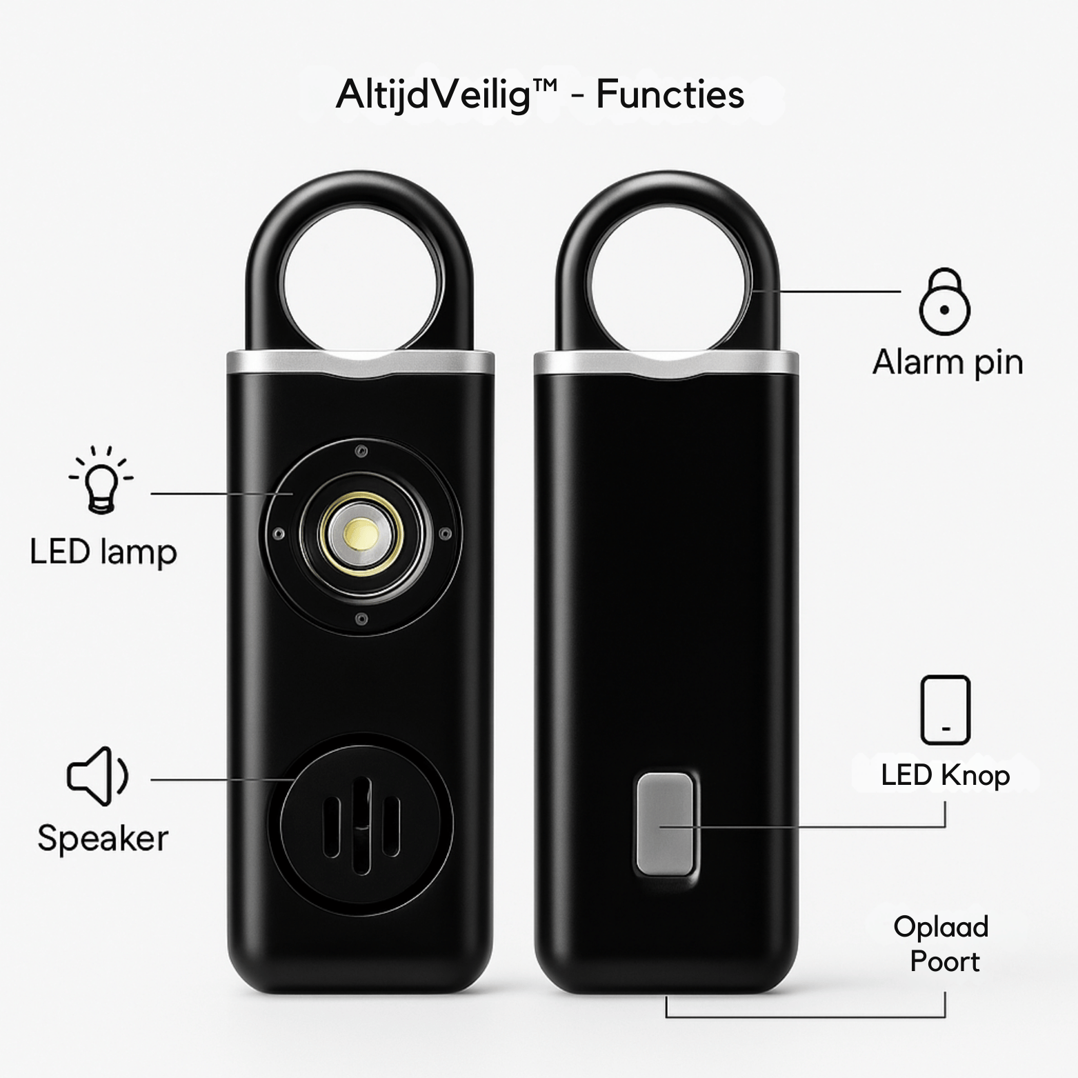 Het AltijdVeilig™ Persoonlijk Alarm heeft een extreem luid 130dB alarm, een krachtige LED-flitsfunctie, een discreet & stijlvol design en de mogelijkheid om via de app je locatie te delen met vertrouwde contacten.